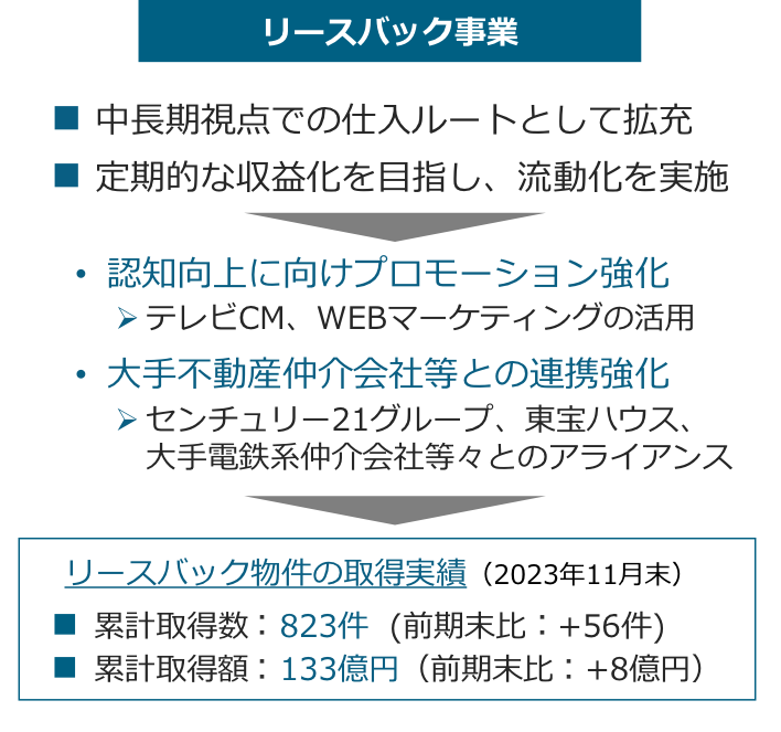 リノヴェックスマンション販売は、販売件数が前年同期比で11.6%増の652件だったことに加え、平均販売価格が前年同期を9.5%上回る2,856万円に上昇し、売上高は前年同期比22.9%の増収に。