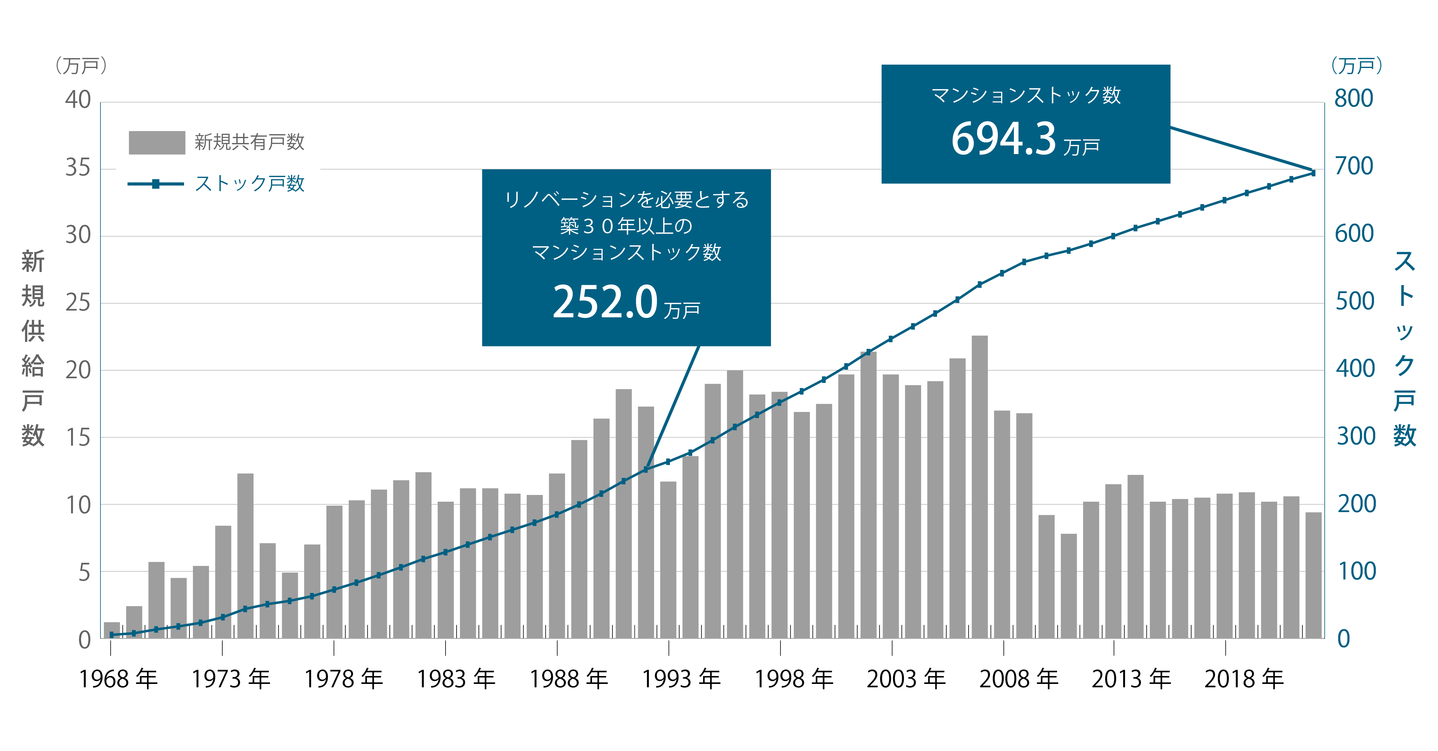 - ※1968年以前の分譲マンションの戸数は、国土交通省が把握している公団・公社住宅の戸数を基に推計した戸数。