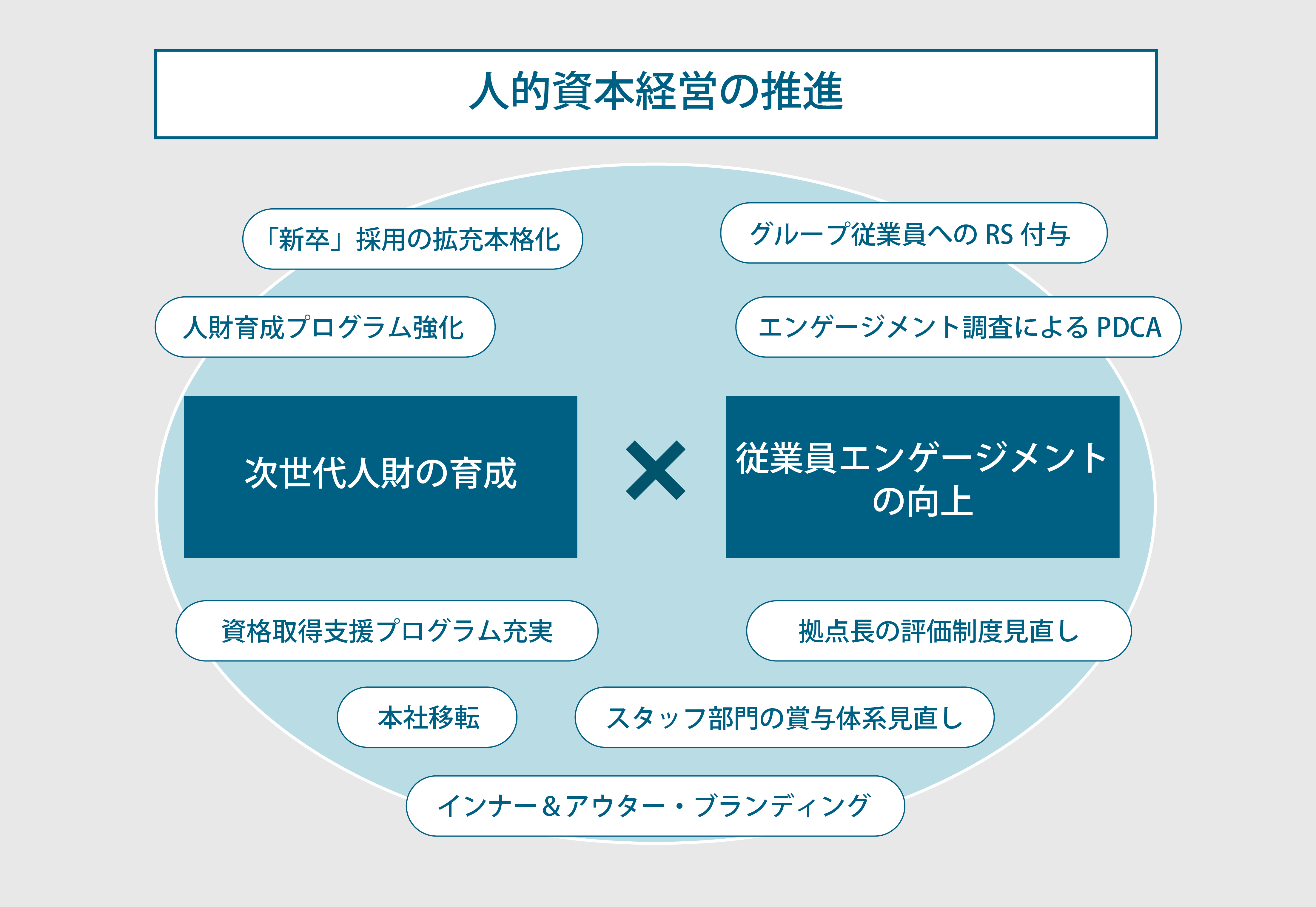 また、課題抽出・改善のためのエンゲージメント調査の実施、表彰制度の拡充、社内交流の活性化などで、人的資本経営を推進してまいります。