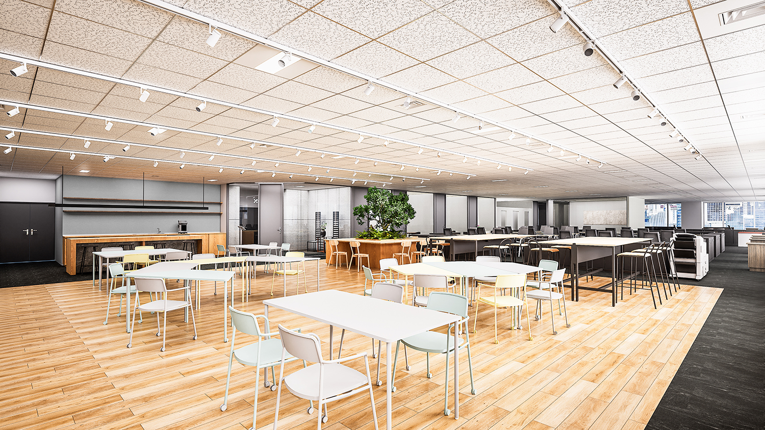 当社は2025年2月に、本社オフィスの移転を計画しています。新たなオフィスでは、フリーアドレス制を採用しながら、従業員同士が活発にディスカッションできるフリースペースを多く設置し、業務の効率化やコミュニケーションの活性化によるパフォーマンス向上を図る設計にしています。