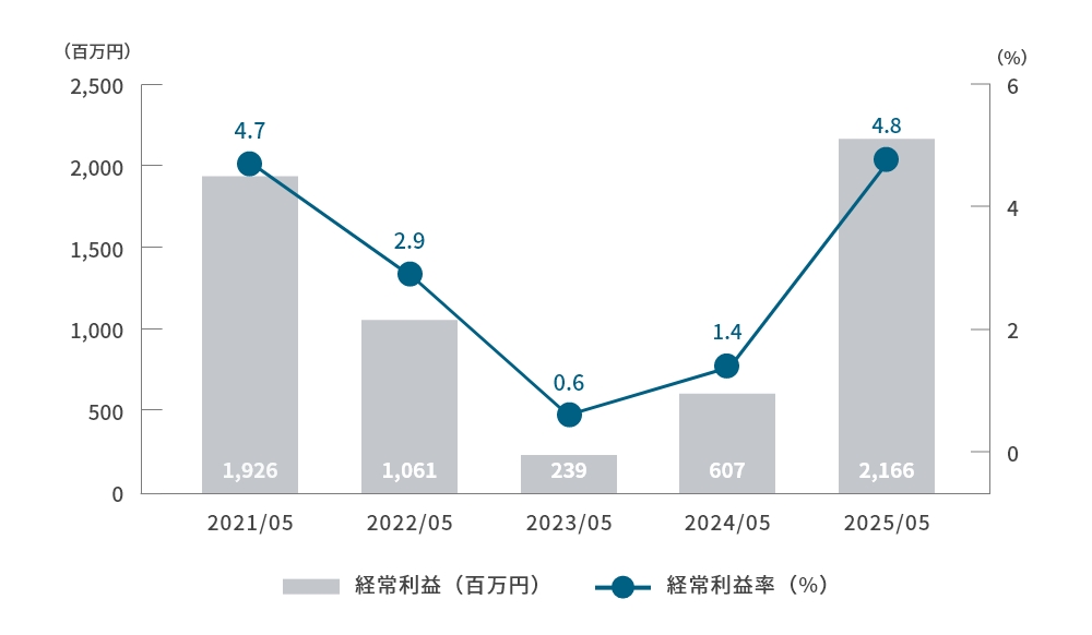 | 経常利益率(%) | 4.7 | 2.9 | 0.6 | 1.4 | 4.8 |