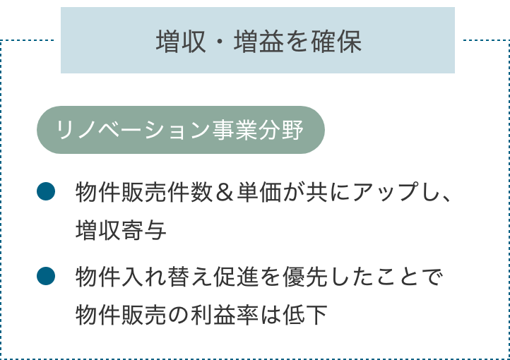 リノヴェックスマンション販売は、販売件数が前年同期比で11.6%増の652件だったことに加え、平均販売価格が前年同期を9.5%上回る2,856万円に上昇し、売上高は前年同期比22.9%の増収に。