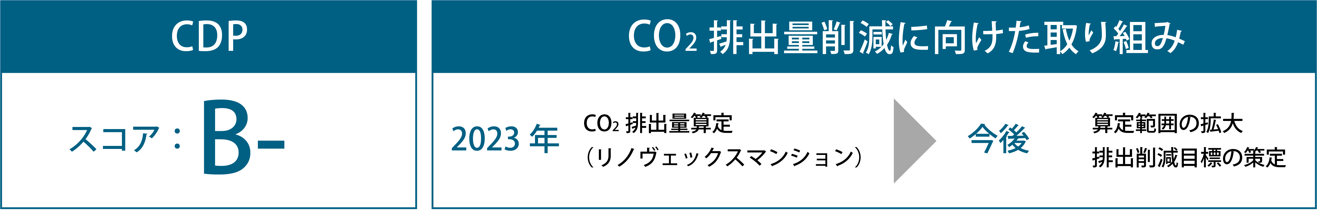 当社グループにおいても、日本政府の「2050年カーボンニュートラル宣言」に向け、GHG排出量削減に向けた取り組みを行っています。ファーストステップとして、主にリノヴェックスマンション事業におけるScope1、Scope2及びScope3のCO2排出量の算定・開示を行っています。今後は算定範囲を拡大し、具体的な削減目標を策定し、環境負荷の低減を進めてまいります。